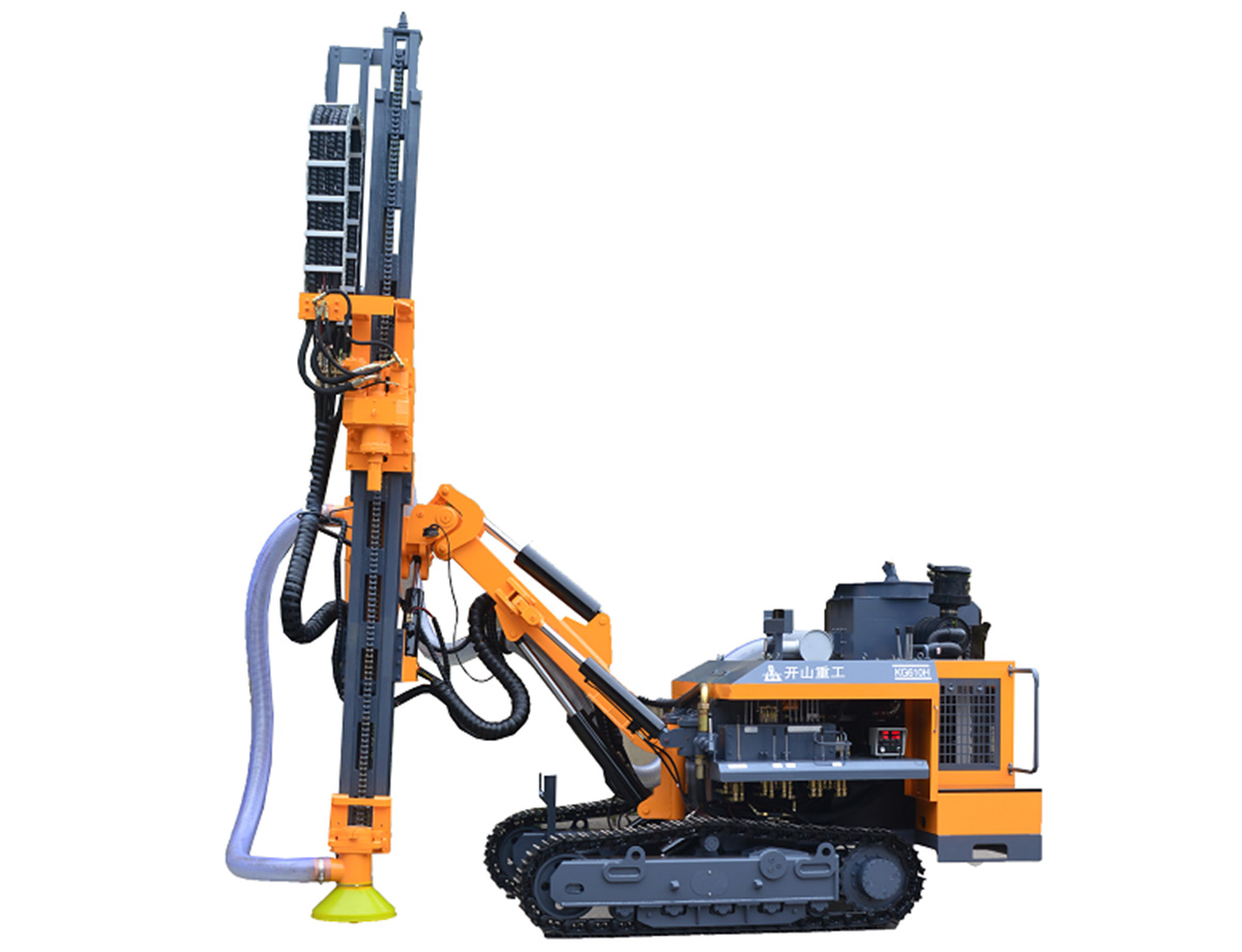 KG610/KG610H型露天潛孔鉆車是應(yīng)國家對環(huán)保要求而進(jìn)行升級的一款新設(shè)備。配備玉柴四缸國三發(fā)動(dòng)機(jī),滿足國家對排放和環(huán)保的要求。采用柱塞行走馬達(dá),折邊履帶架和工程四輪一帶,提高工作壓力,增加爬坡性能。增大俯仰和舉臂油缸,滿足極限位置使用要求。同時(shí)對液壓系統(tǒng)升級,增大系統(tǒng)流量,提高回轉(zhuǎn)轉(zhuǎn)速?;剞D(zhuǎn)器采用雙馬達(dá)減速器,增大回轉(zhuǎn)扭矩和轉(zhuǎn)速。對加大提升油缸和鏈條,提高提升力和可靠性。加固導(dǎo)軌和增加滑板上下耐磨板,延長使用壽命。導(dǎo)軌采用傾斜安裝,方便操作和觀察。罩殼采用加厚型材折邊,增加強(qiáng)度和剛性,增加起吊吊環(huán),方便裝卸吊裝。
