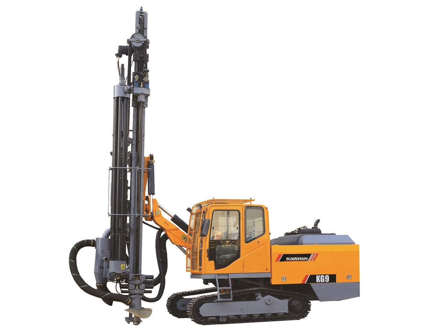 KG9型露天潛孔鉆車的行走、推進、回轉及角度調整等動作均采用液壓驅動,動力強勁;沖擊采用高風壓氣動沖擊,鑿巖效率高;配有液壓干式集塵器收集粉塵,減少對環(huán)境的污染。鉆車還配有直線式接缷桿系統(tǒng)、浮動接頭和自動噴油裝置(保護鉆桿螺紋)、空調駕駛室(提供舒適的工作環(huán)境)、自動控制防卡釬系統(tǒng)(減少卡鉆機率)等模塊。鉆車具有自動化程度高、節(jié)能高效、舒適環(huán)保、操作方便、行駛安全等特點。