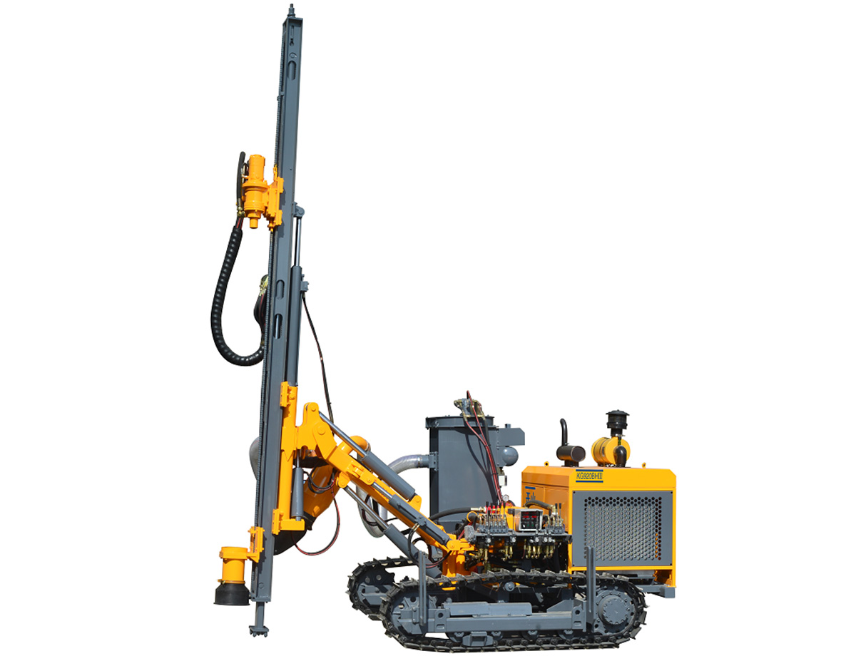 KG920BIII型露天潛孔鉆車是應國家對環(huán)保要求而進行升級的一款新設備。配備玉柴雙缸國三發(fā)動機,滿足國家對排放和環(huán)保的要求。靈活的變幅機構,可滿足鉆鑿低位水平孔功能,同時對液壓系統(tǒng)升級,增大其系統(tǒng)流量,提高回轉(zhuǎn)轉(zhuǎn)速。對提升油缸進行優(yōu)化,提高其可靠性,加固導軌和增加滑板上下耐磨板,延長使用壽命。增加起吊吊環(huán)(板),方便裝卸吊裝。