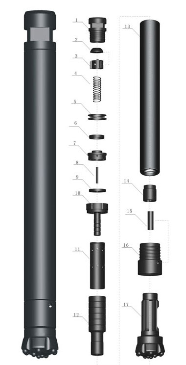 采用了當(dāng)代最新鑿巖理論設(shè)計沖擊器內(nèi)部結(jié)構(gòu)尺寸,使沖擊器獲得最理想的能量傳遞,因此,沖擊器鑿巖速度快,耗風(fēng)量低。采用了最優(yōu)質(zhì)的原材料和最先進(jìn)的加工工藝,因此,沖擊器性能穩(wěn)定、壽命長。采用了最簡單可靠并且拆裝容易的內(nèi)部結(jié)構(gòu),因此,沖擊器故障低,維修方便。前接頭采用了多頭螺紋和外缸聯(lián)接,因此,沖擊器拆卸鉆頭容易。沖擊器雖然獨(dú)具設(shè)計,但前后接頭可與市場常規(guī)的鉆桿和鉆頭相匹配。